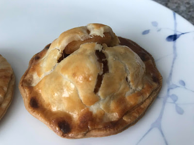 I don't like pie enough to make it very often. Hence one reason I haven't mastered pie dough. I can make a decent one but nothing special. I cheated for this trial and got those pre-made pie dough. Past experience says it isn't as good as homemade pie dough but I was just in experimenting mode so I wasn't going to be that fussy about it. Plus, there's something to be said for easily rolling out the pre-made dough to a slightly thinner thickness and equally easily cutting the dough into the rounds I wanted to make the pies.
